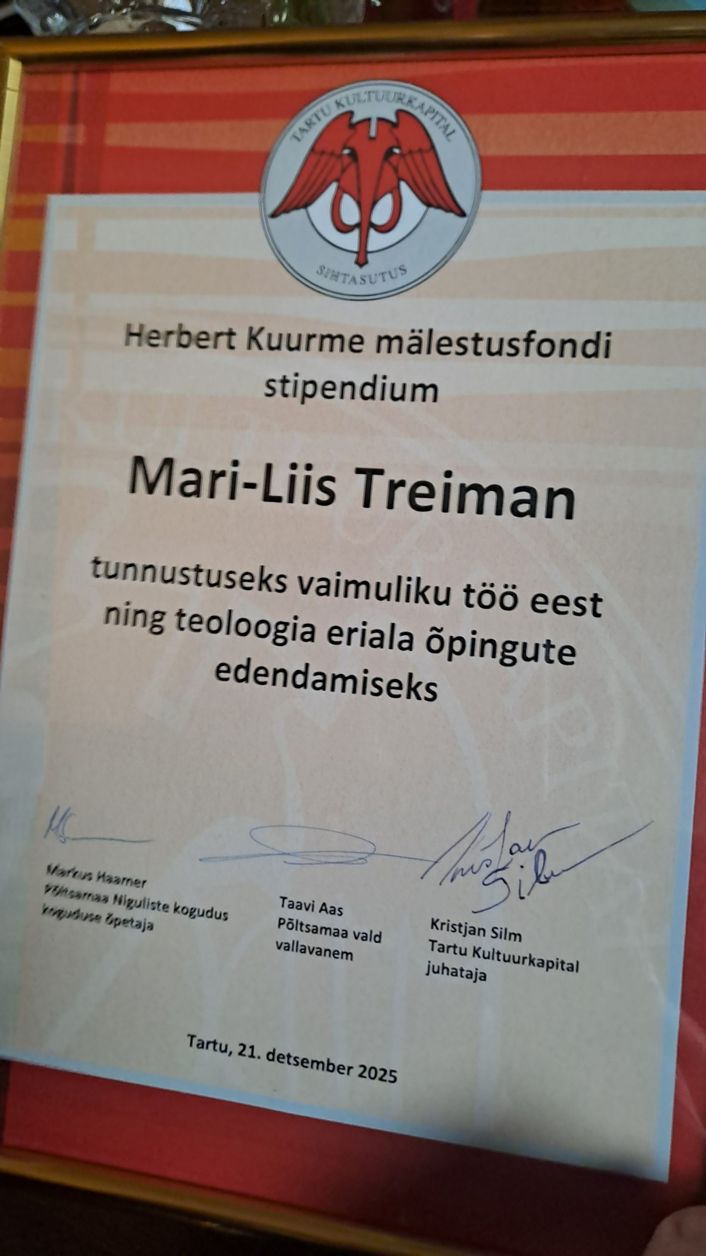 Mari-Liisi jaoks (kes osales preemia üleandmisel kohapeal) on stipendium lisaks teoloogiaõpingute toetamisele ka sügava tähendusega tunnustus, mis kinnitab senise töö väärtuslikkust ning annab innustust edaspidiseks. Stipendiumi üleandmine oli Mari-Liisi sõnul usaldusavaldus, milles ta tunnetas ka kaasnevat vastutust. Mari-Liisi jaoks muutis sündmuse eriliselt südamlikuks Herbert Kuurme poja Mart Kuurme isiklik õnnitlus. Üleandmisel osalesid ka Põltsamaa Niguliste õpetaja Markus Haamer, Põltsamaa vallavanem Taavi Aas ja Tartu kultuurkapitali juhataja Kristjan Silm.